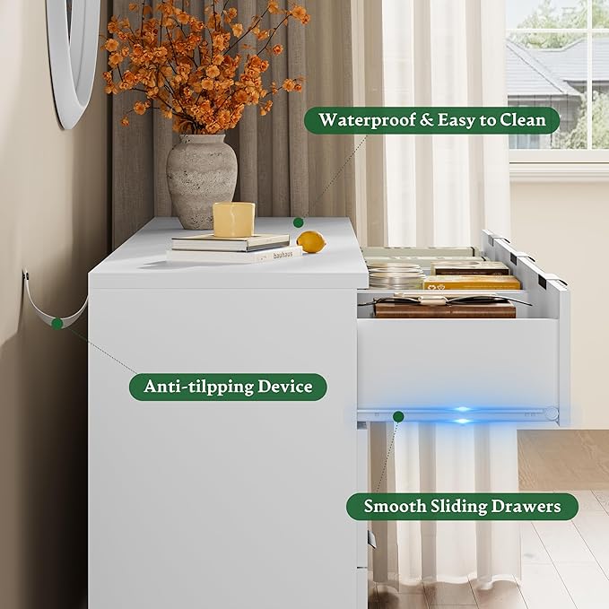 - 【Solid Material & Study Construction】The dressers & chests of drawers are constructed from optimal MDF, P2 engineered wood and coated metal handles which not only have exquisite texture, but also ensure long-term use and are scratch resistant. Each drawer holds up to 25 lbs and the thickened tabletop can support up to 180 lbs. For easy cleaning, just wipe with damp cloth and get it air-dried