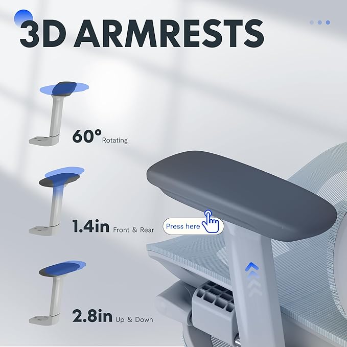 - 3D Armrests: Fully adjustable armrests (height, forward/back, and swivel) allow for precise positioning to reduce arm strain during extended use.