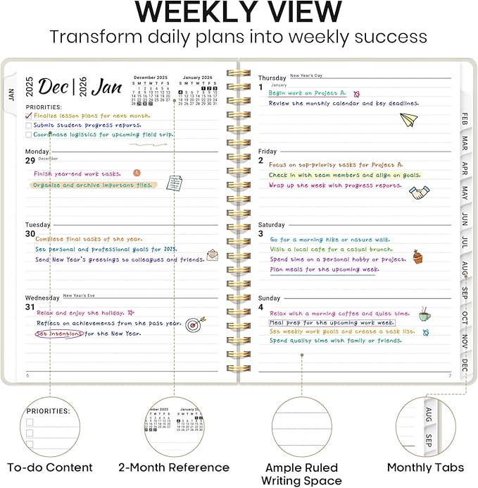 - Thoughtful Weekly Layout: Our planner features each two-page weekly spread, from Monday to Sunday, offering ample lined writing space. It also includes popular holidays, two-month reference previews, and a dedicated priorities area, making it easy to manage appointments, notes, and daily tasks.