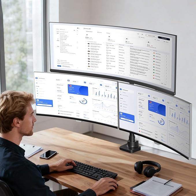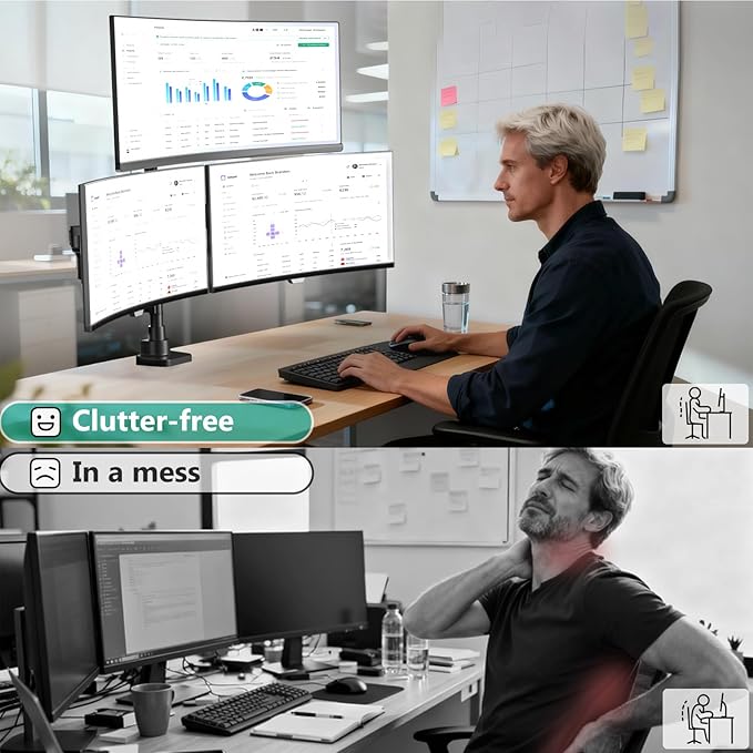 - Full Ergonomic Adjustment: Experience ultimate flexibility with independent adjustments for each monitor: center monitor adjusts with +50° to -20° tilt and +90° to -90° swivel, while side arms offer +50° to -20° tilt, ±180° swivel, and ±360° rotation, allowing you to find the perfect, comfortable viewing angle for work, gaming, or creative projects, turning every seat into the best seat in the house.