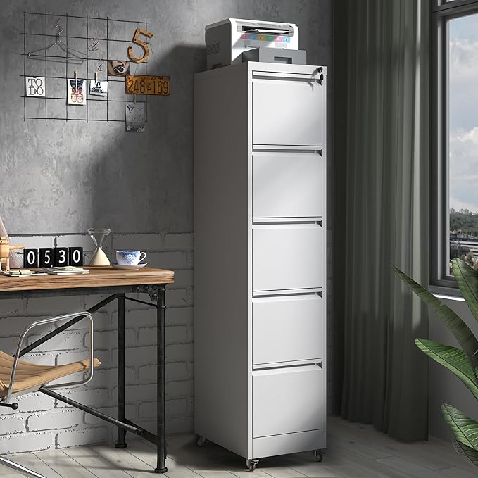 5 Drawer File Cabinet with Wheels,Metal Mobile Filing Cabinets with Lock,Vertical File Cabinet for Home Office,Heavy Duty Storage Cabinet for A4/Letter/Legal Size File,Assembly Required