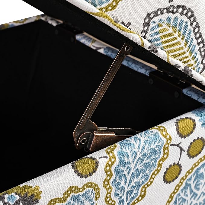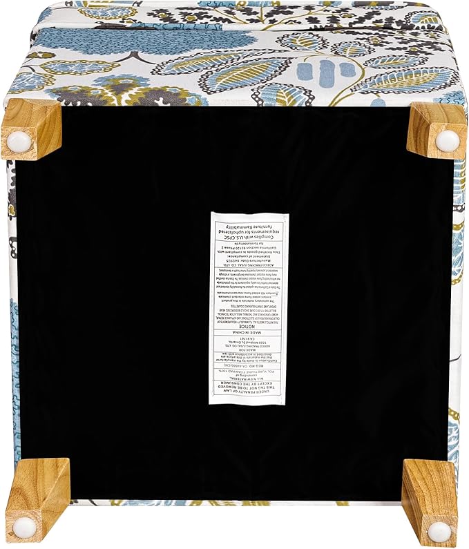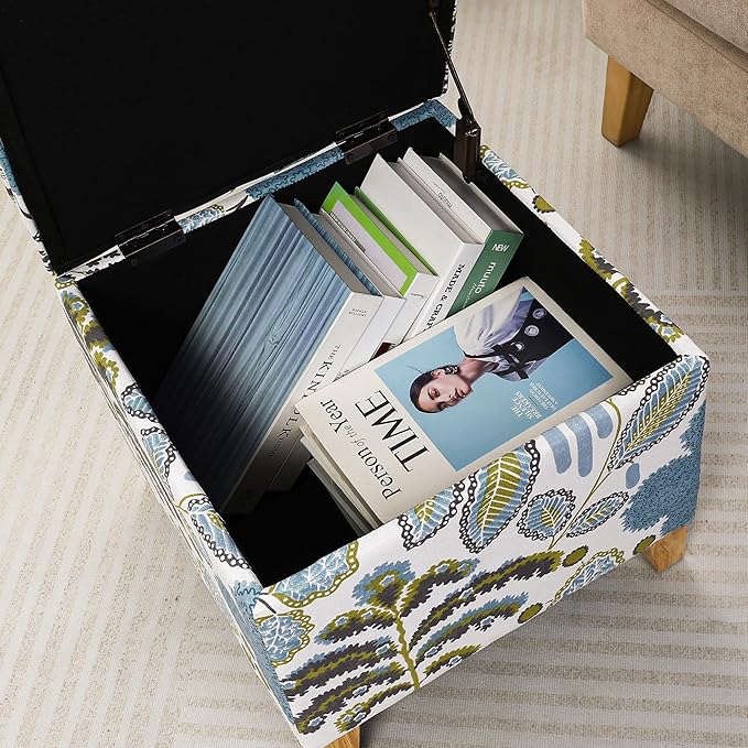 Adeco 18 Inch High Cube Ottoman Storage, Linen Chair Foot Stools, Upholstered Vanity Stool with Hinged Lid, Solid Wood Legs (Blue Leaves)