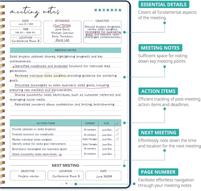 - Boost Meeting Efficiency: A meeting notebook helps you manage and streamline meeting details, ensuring discussions, decisions, and action items are accurately captured and organized. It promotes a more efficient workflow, allowing for easy reference and retrieval of information during and after the meeting.