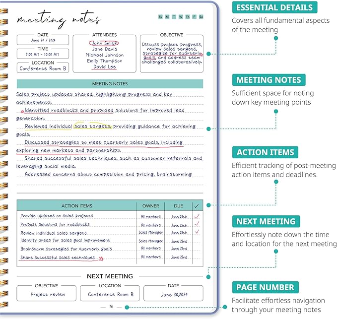 - Boost Meeting Efficiency: A meeting notebook helps you manage and streamline meeting details, ensuring discussions, decisions, and action items are accurately captured and organized. It promotes a more efficient workflow, allowing for easy reference and retrieval of information during and after the meeting.