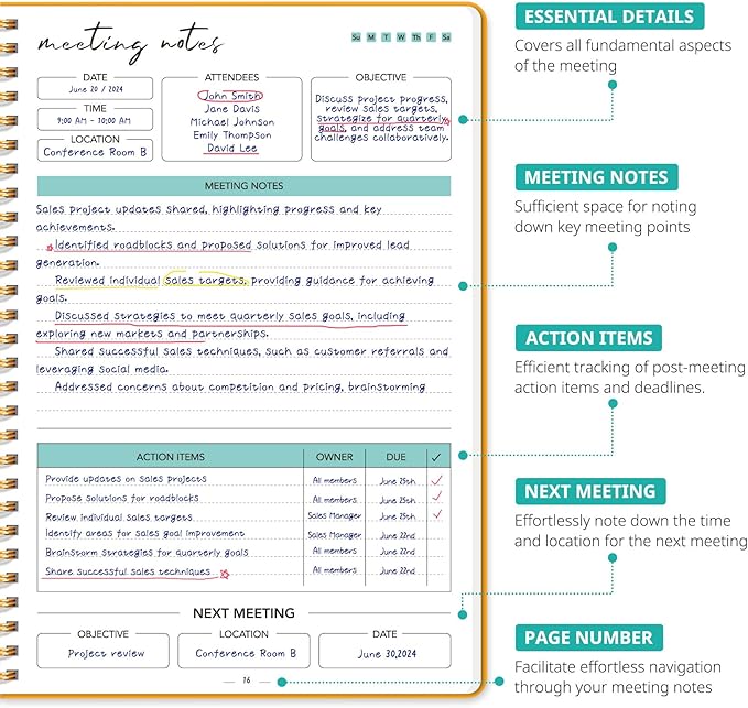 - Boost Meeting Efficiency: A meeting notebook helps you manage and streamline meeting details, ensuring discussions, decisions, and action items are accurately captured and organized. It promotes a more efficient workflow, allowing for easy reference and retrieval of information during and after the meeting.