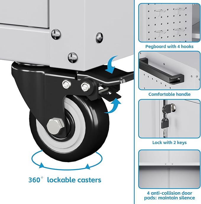 - [Effortless Mobility] Featuring 360° swivel silent casters with lockable rubber wheels, our metal storage cabinet moves easily without damaging your floors.