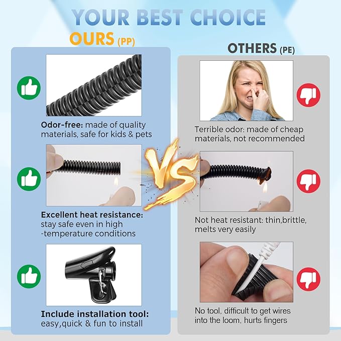 - ✳️✳️✳️ Premium Material - Unlike the cheap, thin, and brittle tubing that cracks or melts easily, our wire loom is made of premium polypropylene (PP). It offers excellent heat and abrasion resistance, protects against pet chewing, perfect for DIY projects and automotive wiring. The ideal solution for organizing messy or exposed wires.