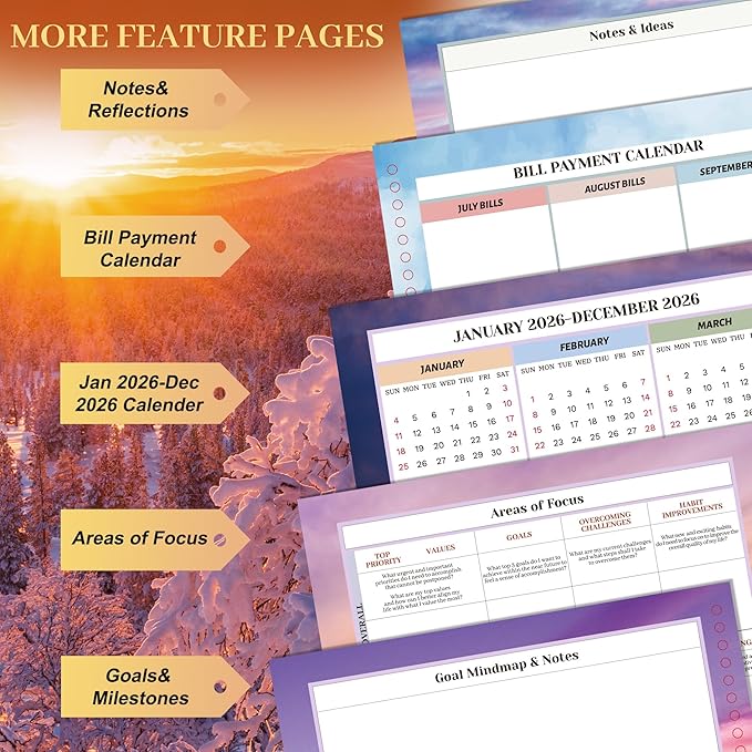 - Free Stickers & Premium Paper: Jan 2026-Dec 2026 planner comes with 2 pages of free stickers, ribbon bookmark to mark the pages you need to turn to immediately, a practical back pocket to keep loose cards or documents! The 100 GSM paper is good and thick enough that nothing bleeds through. And pretty and practical monthly Tabs help quickly find the month!
