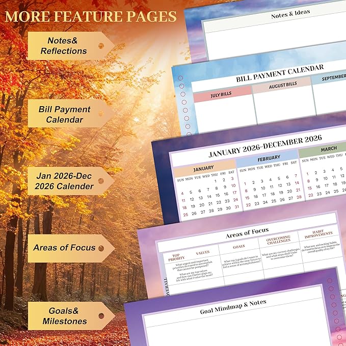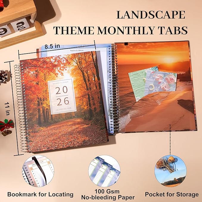- Free Stickers & Premium Paper: Jan 2026-Dec 2026 planner comes with 2 pages of free stickers, ribbon bookmark to mark the pages you need to turn to immediately, a practical back pocket to keep loose cards or documents! The 100 GSM paper is good and thick enough that nothing bleeds through. And pretty and practical monthly Tabs help quickly find the month!