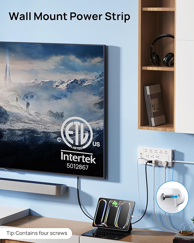 - Under Desk Power Strip Design: This wall mount power strip features a screw-mountable design with four mounting tabs, 4 screw-mounting tabs allow you to securely install this surge protector power strip in various applications, including the entertainment center, behind the TV, dorm room, guest room, garage, desktop, under desk/counters, workbenches, etc.