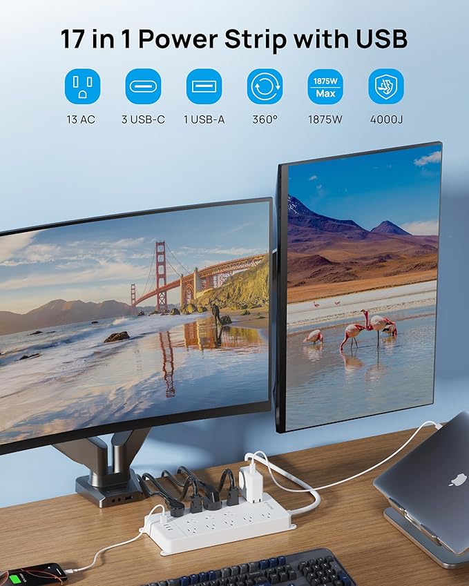 - 17-in-1 Power Strip with USB C Ports: This versatile extension cord with multiple features 13 widely spaced AC outlets and 1 USB-A & 3 USB-C ports, It supports 1875W/15A and universal voltages (100V-250V), Its spacious layout can accommodate large adapters side by side, making it perfect for larger setups such as gaming stations, media centers, or home offices.