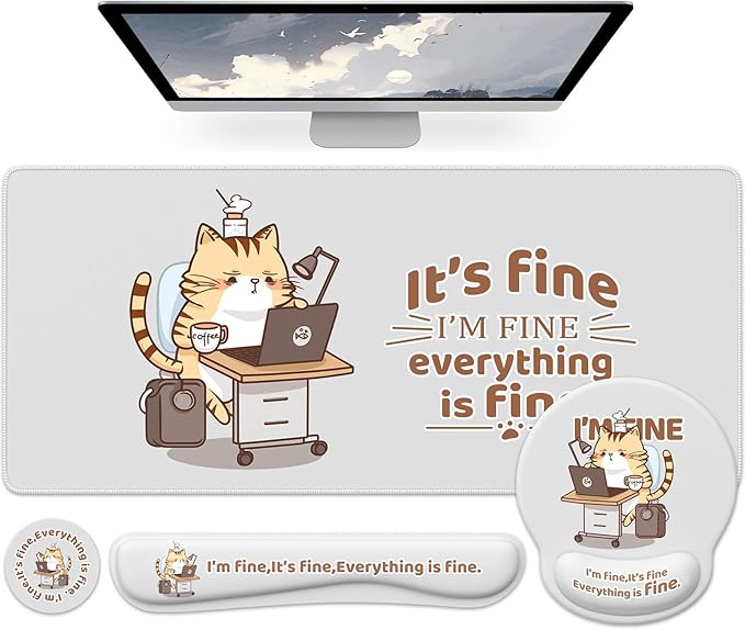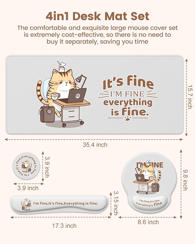 - Package Includes: XXL desk mat (35.4"×15.7"), memory foam wrist rest (17.8" x 3.3"), ergonomic mouse mat (9" x 10"), Coaster (3.5"). Our 4-in-1 Set will complete the look and feel of your desk