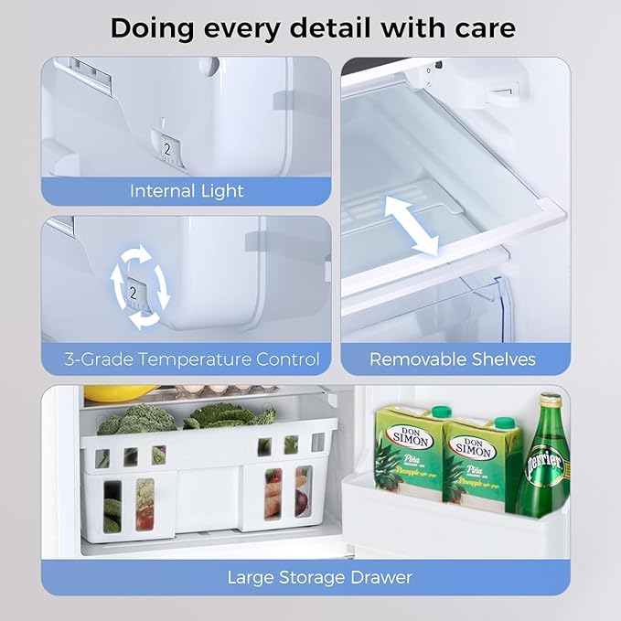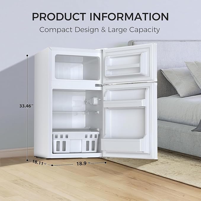 - 【Compact Size & Large Capacity】- The double door electric fridge with 18.31"(W)x 32.38" (H)x 19.37"(D). 0.93 Cu.ft freezer features ample storage space can be used storage your ice cream,meat. And 2.27 Cu.ft fridge area with fruit and vegetable drawer Separately,can keep fruits and vegetables fresh longer. The inside of the door with racks (which prevent from falling)also can store food,you can place bottles and cans.More spacious than usual mini-fridge