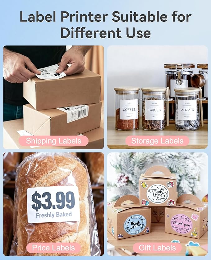 - Versatile for Home and Business Use–Compact yet efficient, this thermal printer fits a variety of work settings including retail shops, offices, and warehouses. It prints shipping labels, price tags, barcodes, and inventory stickers effectively. A practical label printer for small business that helps organize workflow and improve operational efficiency