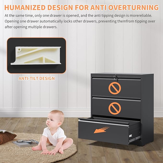 - 【Secure & Stable Design】Central lock secures all 3 drawers with 2 keys, while the anti-tilt safety interlock allows only one drawer to open at a time. Wall-mounting hardware included for added stability.