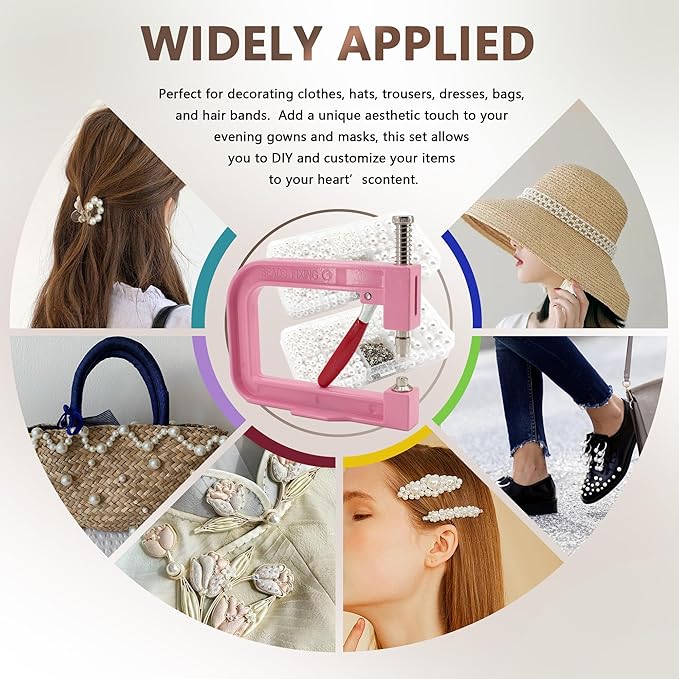 - Package Included: 1pc pearl setting machine, 2 box of white pearls with rivets, 4pcs different sizes model heads(4mm, 5mm, 6mm, 8mm, 10mm) and 1pcs hexagon wrench. Sufficient quantity of pearls and tools to meet your usage needs.