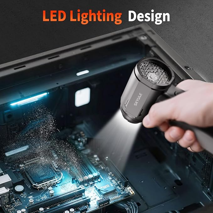 - 【Wide Application】SKYULE RS30 Ultra Turbo Air Duster comes with 3 nozzles and 2 brushes, the dust blower can meet all your cleaning and outdoor needs,uch as pc, keyboards, home appliances, car interiors, etc. You can also use it as a jet blower for picnic fires, snow blower/ leaves, inflating and drying pet hair, and it with the bright LED light, you can see and clean every corner simultaneously, even in complete darkness.