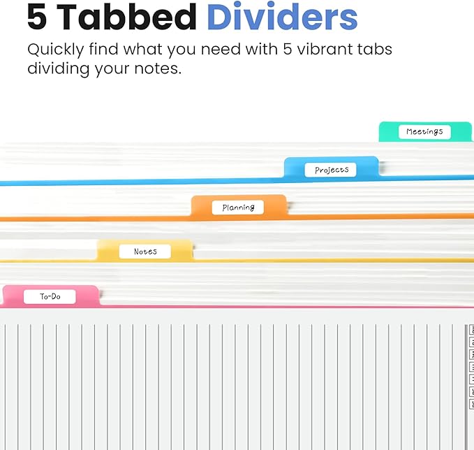 - 5 Subject Notebook with Dividers & Tabs: Stay organized with this 5 subject notebook, featuring 5 removable plastic dividers with tabs and 10 self-adhesive labels. These writable tabs make it easy to customize and categorize your notes for different subjects or projects—perfect for both school supplies and work planning.