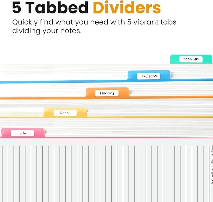 - 5 Subject Notebook with Dividers & Tabs: Stay organized with this 5 subject notebook, featuring 5 removable plastic dividers with tabs and 10 self-adhesive labels. These writable tabs make it easy to customize and categorize your notes for different subjects or projects—perfect for both school supplies and work planning.