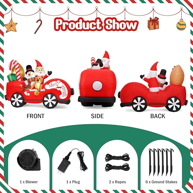 - ššššš„š & šššš--This Christmas outdoor decorations come with 8 LED lights, 6 ground stakes, 2 ropes, 1 built-in fan, which will keep the inflatable firmly fixed to the ground.No need to worry our Christmas Inflatable will fly away by the wind. The certified for UL and uses 12 volts, making it even safer