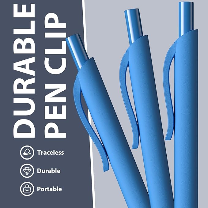 - 【Practical & Simple Design】Secure Clip & No Mess Design– can firmly clip the soft grip blue ink gel click pen bulk to a book, notebook or bag, easy to carry, without worrying about losing; retractable design, gently press the cap, the pen end automatically retracts.