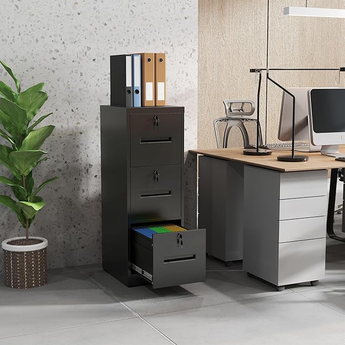 - 【High Quality & Durable】Crafted from heavy-duty cold-rolled steel, this locking file cabinet is built to withstand daily wear and tear, ensuring long-lasting durability. The powder-coated surface enhances its resistance to scratches, rust, and corrosion. Sturdy construction ensures it can hold a significant amount of weight without warping or bending, making it a reliable choice for storing heavy files and documents.