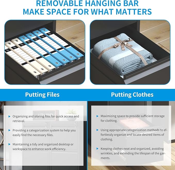 - 【SPACIOUS & ADJUSTABLE STORAGE】This 3 drawer file cabinets features fully extended drawers with silent smooth ball-bearing glide rails, providing a quiet filing experience and spacious storage space.Each drawer of the metal file cabinet is equipped with an adjustable hanging rod, accommodating A4, letter, legal size folders and file box, convenient to declutter your space.