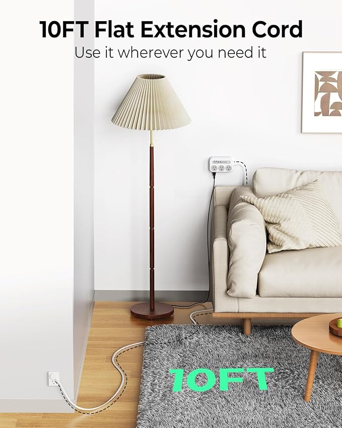 - 【10 FT Flat Extension Cord】Long and flexible cord reaches any spot, fitting through narrow spaces. Enables easy furniture rearrangement. Ultra-thin 3mm cable hides easily, reducing clutter and tripping risks. Keeps rooms tidy and safe for children and pets