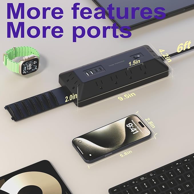 - 16-in-1: This power strip with USB ports supports 16 devices at once, 12 AC outlets, 2 USB-C, 2 USB-A, plus a button switch. It can replace traditional phone chargers, keeping your desk tidier