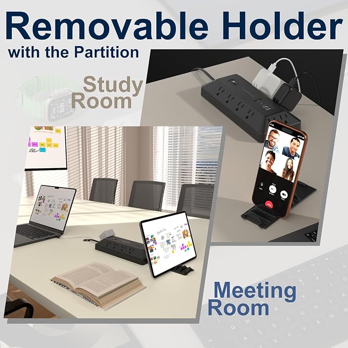 - REMOVABLE DIVIDERS: This power outlet features removable dividers. Its 6 slots of varying widths allowing you to neatly organize up to 6 phones and say goodbye to tangled charging cables. It not only organize electronic devices as charging station but also double as holder for phones or pads