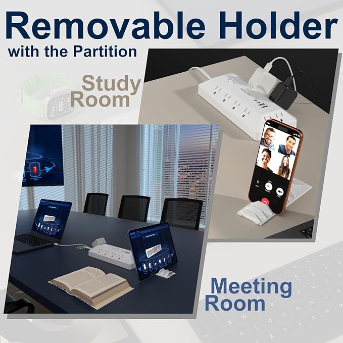 - REMOVABLE DIVIDERS: This power outlet features removable dividers. Its 6 slots of varying widths allowing you to neatly organize up to 6 phones and say goodbye to tangled charging cables. It not only organize electronic devices as charging station but also double as holder for phones or pads