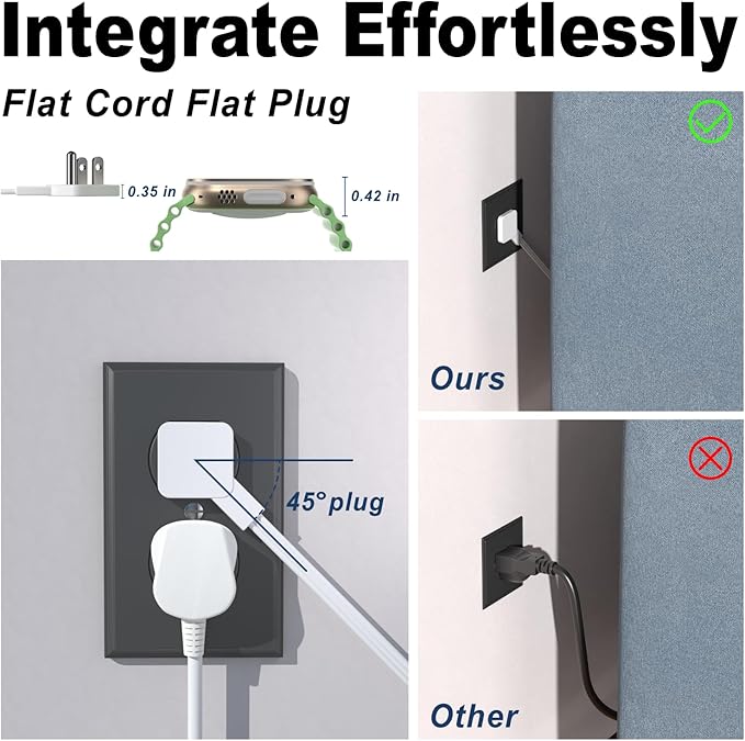 - FLAT PLUG & FLAT CABLE: This 6 ft multi plug outlet features a flat extension cord and a 45°degree angled flat plug (only 0.35 inches) design. It easily navigates tight spaces - behind walls, under sofas or beds, or behind desks - without pushing furniture away from the wall