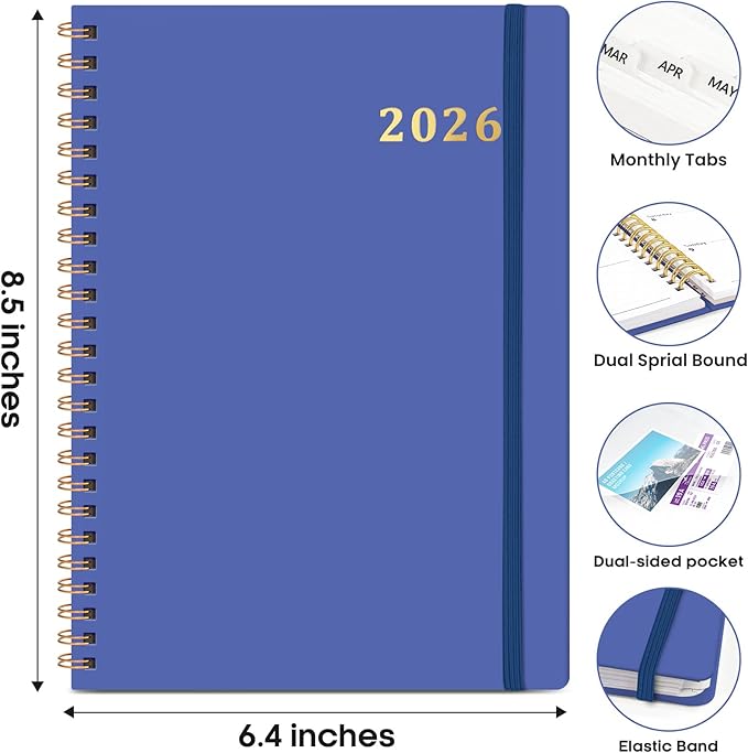 2026 Planner, Weekly and Monthly Calendar Planner Book, January 2026 - December 2026, Hardcover Spiral Planner with Monthly Tabs, Notes Pages, Perfect for Women & Men, A5 (6.4" x 8.5") - Royal Blue