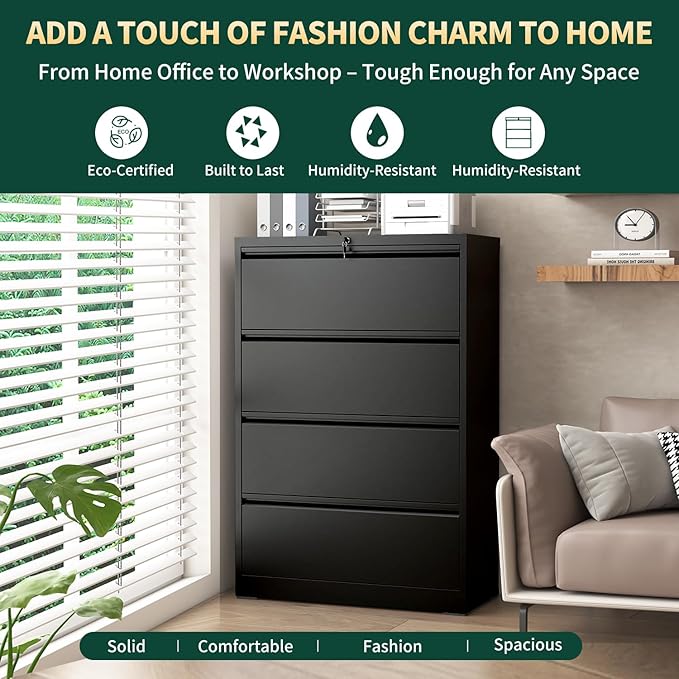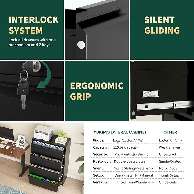 - 【Anti-tilt System】: This 4 drawer lateral file cabinet with lock meet your needs. It has has a anti-tilt design, ensuring that only one drawer can be open at a time. By preventing multiple drawers from being open simultaneously, the office cabinet maintains stability and greatly reduces the risk of tipping. You can have peace of mind knowing that your documents and equipment are secure.