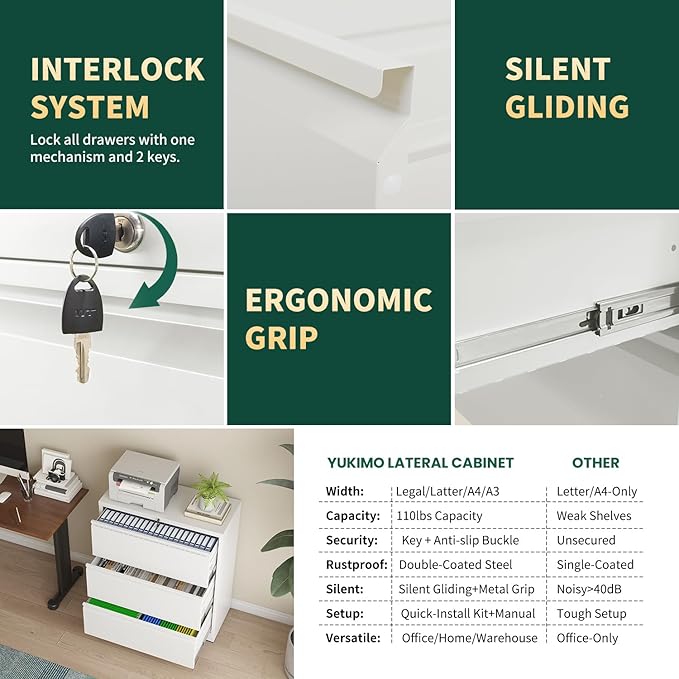 - 【Anti-tilt System】: This 3 drawer lateral file cabinet with lock meet your needs. It has has a anti-tilt design, ensuring that only one drawer can be open at a time. By preventing multiple drawers from being open simultaneously, the office cabinet maintains stability and greatly reduces the risk of tipping. You can have peace of mind knowing that your documents and equipment are secure.