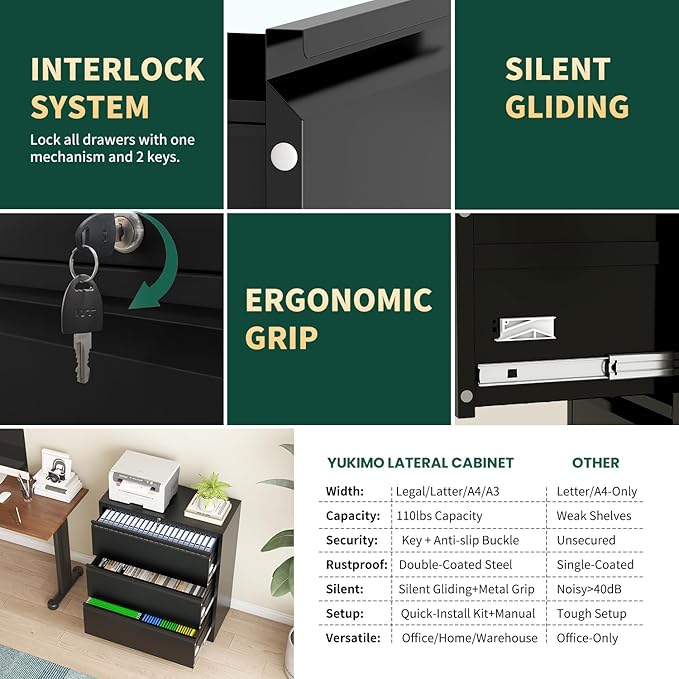 - 【Anti-tilt System】: This 3 drawer lateral file cabinet with lock meet your needs. It has has a anti-tilt design, ensuring that only one drawer can be open at a time. By preventing multiple drawers from being open simultaneously, the office cabinet maintains stability and greatly reduces the risk of tipping. You can have peace of mind knowing that your documents and equipment are secure.