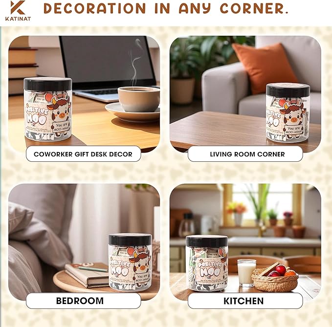 - 🐮 Adorable Cow Decor for Desk, Room, or Office Beyond the affirmations, this jar is designed with a stylish cow print label, making it a unique piece of cow desk decor. Place it on your work desk, study table, or living room shelf, and enjoy it as both cute cow decorations and a daily source of motivation.