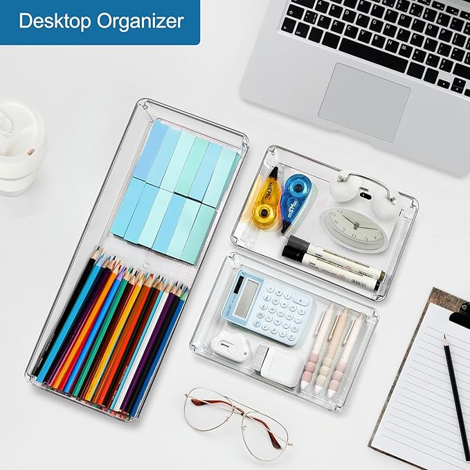 - ENHANCED CAPACITY: 50% larger than standard drawer organizers, providing more space for efficient storage and organization, Crafted from premium PET plastic, our desk drawer organizers are twice as sturdy as other fragile ones.