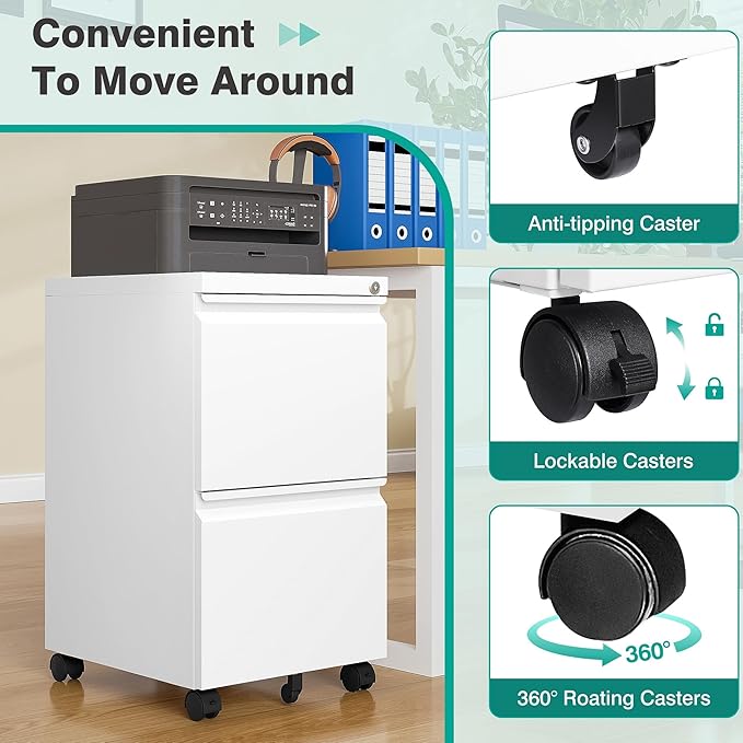 - ✔️【MOBILE DESIGN】: 2 drawer metal file cabinet with lock equipped with 360-degree rotating wheels and lockable casters for smooth mobility,one center caster to prevent tipping,perfect for under-desk storage or moving between workspaces
