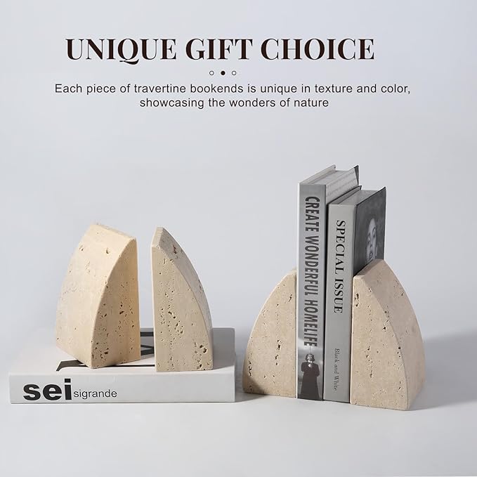 - 【Luxury & Elegant】Koville book ends are made of 100% natural travertine. Each bookend has its own unique textures and colors, no two pieces are exactly the same, revealing the wonders of nature and will be an elegant addition to your tabletop decor