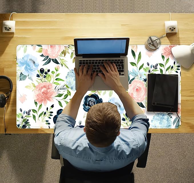 Pink Blue Floral Desk Mat Mousepad Cute Flowers Mouse Pad Gaming XL Large Extended Desk Pad Desk Matt for Desktop, Computer Laptop Keyboard Mouse Mat for Women Office Decor Accessories 31.5x15.7 in