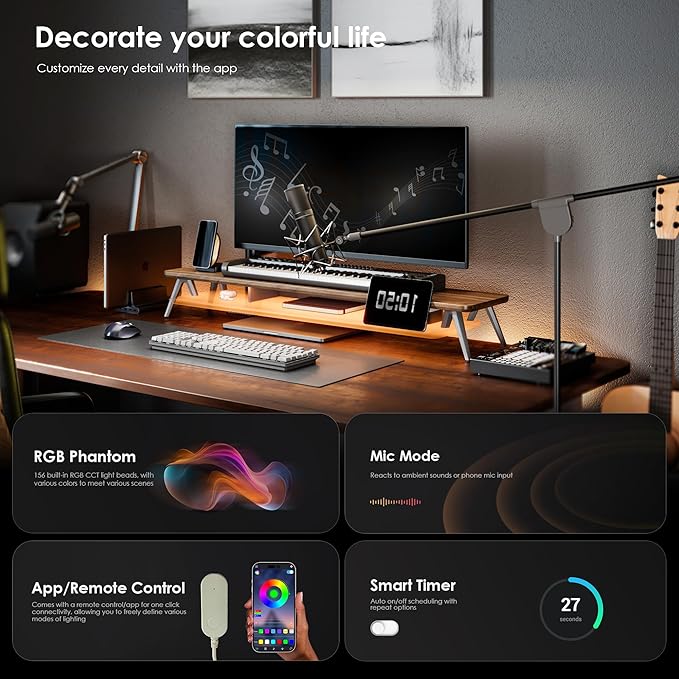 Fenge Dual Monitor Stand for Desk, 2 Tiers Monitor Riser with Acrylic Shelf & App Control LED Lights, 42.5 Inch Wood and Aluminum Desk Shelf with Phone and Tablet Holder