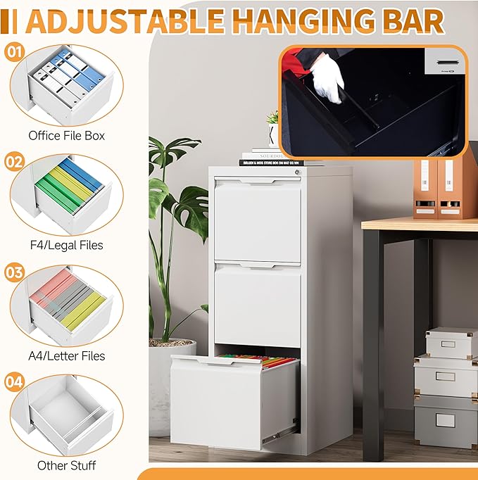 - 【Large Capacity】This vertical file cabinet for home office has large storage space, fully retractable ball bearing drawer slide rails for easy access to all folders, file drawers with adjustable hanging rods can hang A4 size, letter size or legal size hanging folders to make your files well organized.