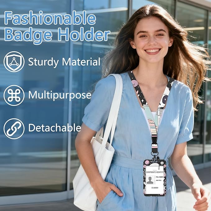- 【Multi-functional】The id holder with lanyard includes a detachable lanyard for keys,a vertical id badge holder and a retractable badge reel with 360 degrees rotate carabiner clip,which is easy to use.To insert your card, simply press the back and push up, suitable for holding work IDs,student IDs,credit cards,and more.In addition,the heavy duty badge reel can be used to attach your keys for added convenience