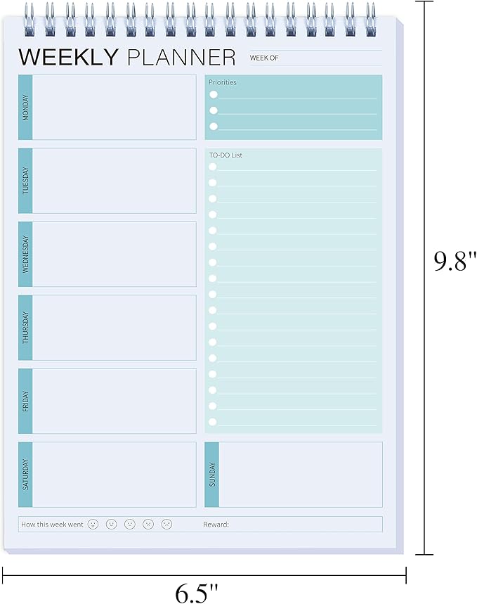 - Undated Weekly Planner: 52 sheets for long-life weekly use and start a fresh! Each daily planner measures 6.5 x 9.8 inches,the perfect size to place your desk and carry on with you during the day