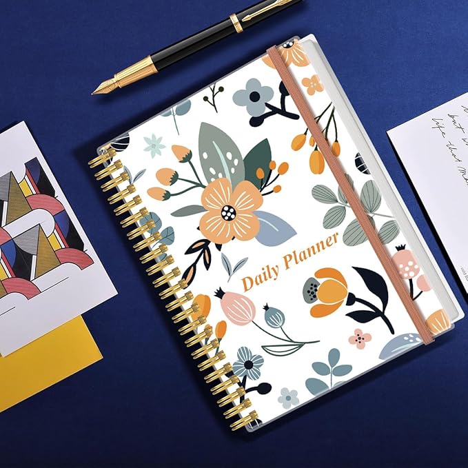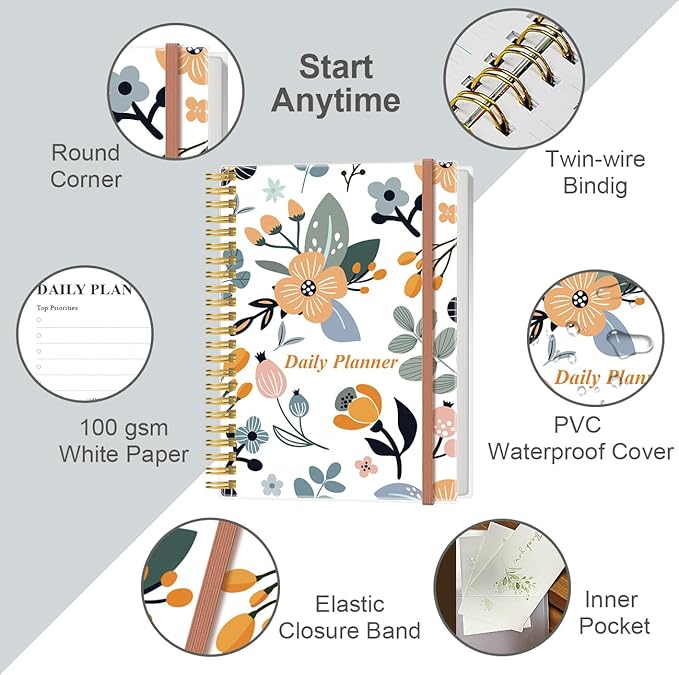 Daily Planner Undated - B5 To Do List Notebook Hourly Schedules, Spiral Appointment Planner for Women and Men, PVC Hardcover, Inner Pocket, Elastic Closure, 7" x 10", Rose Flower
