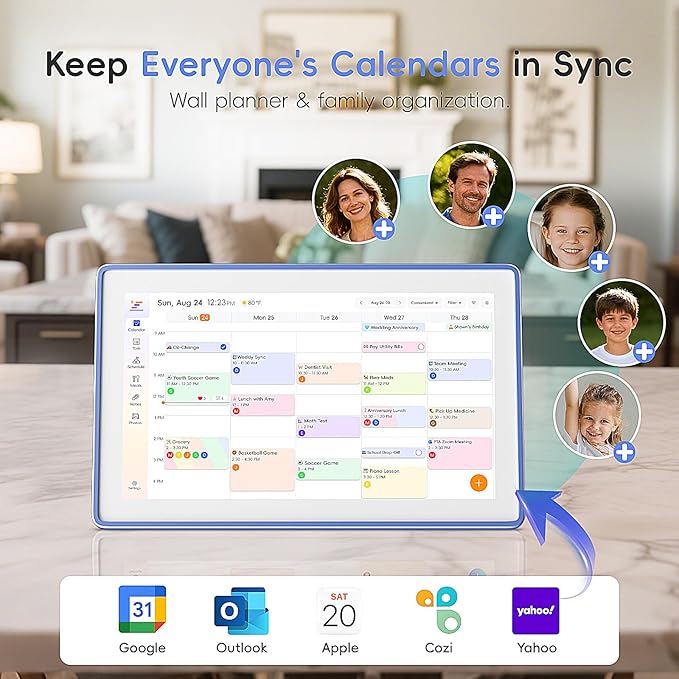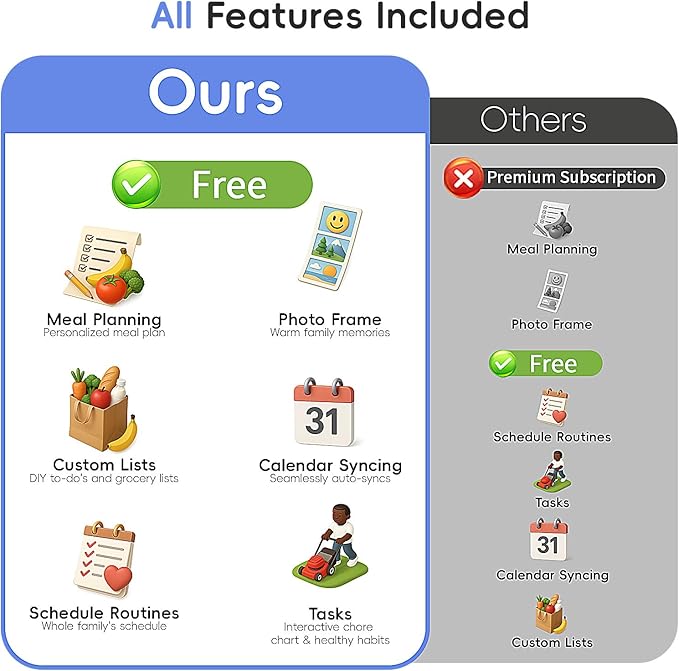 - No subscription Smart Calendar: Enjoy all main functions—schedules, tasks, meal plans, photo display and grocery list—with no subscription. Manage your family's day immediately with everything built-in. No hidden or recurring costs—ever.