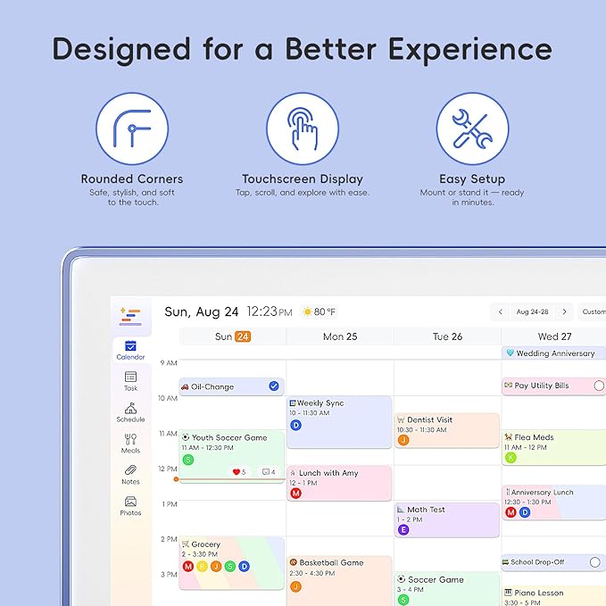 - Stand and Wall-Mount: Includes both a table stand and wall display kit for versatile placement in the kitchen, office, entryway, or living room. Its clean, modern design blends into any home while keeping your family visually connected.