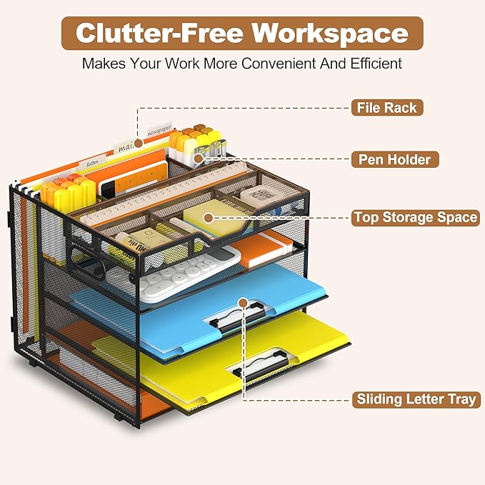 - Clutter-Free Storage-This DocNest Desktop File Storage Rack (under patent application number 30010707) features a multi - compartment design that allows for organized storage of files, stationery, and office supplies. The sliding letter trays enable smooth access to documents, enhancing your work efficiency. With its size (12.6"×11.8"×10.3"), it optimizes desktop space and creates a clutter - free workspace