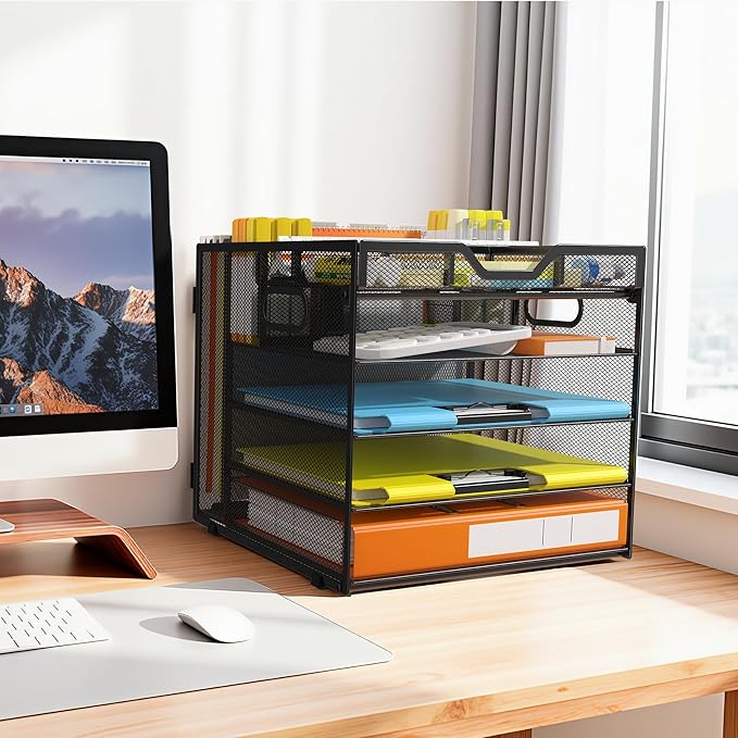 - Sturdy Metal Build and Back Hanging Function-Made of durable metal with a sleek powder-coated finish, this Black 5-tier organizer resists wear for long-term use. It offers stability and a modern professional look, ideal as a desktop file organizer, file holder for desk and core file organizer for desk. The new Hanging File Organizer on the back serving as a hanging file folder organizer expands storage, a must-have for tidy workspaces
